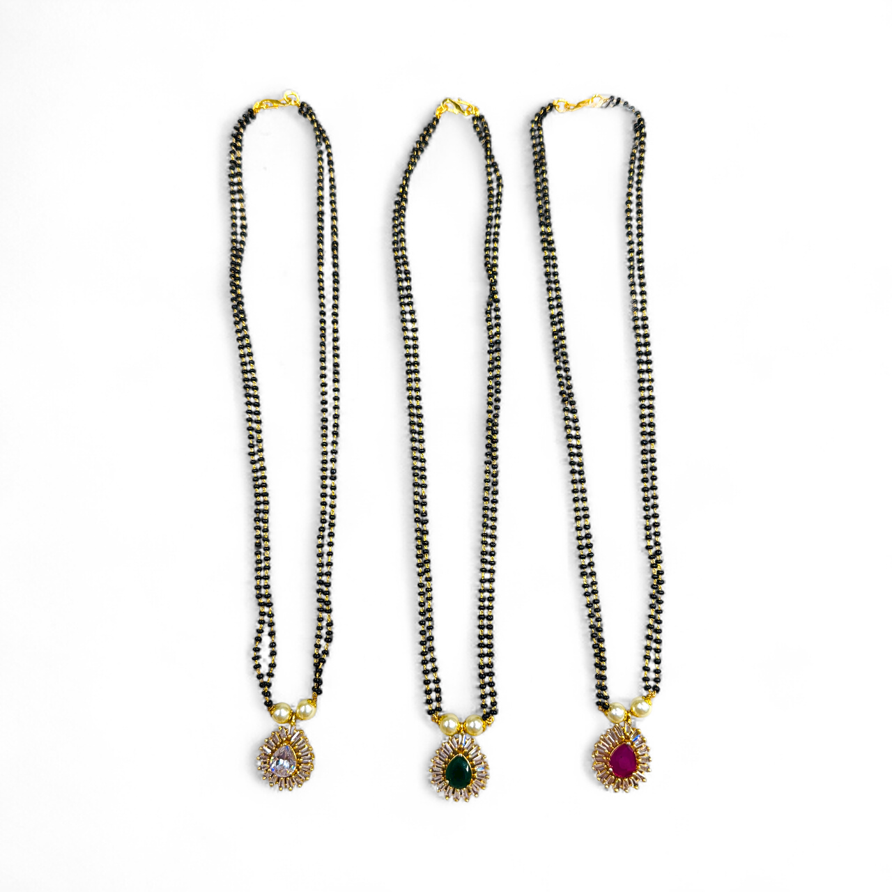 Enhance your everyday elegance with this 24-inch fancy AD mangalsutra, crafted with a sleek double-layer black bead chain and adorned with a stunning American Diamond pendant. The pendant comes in three beautiful color options – white, green, and pink – giving you the perfect blend of tradition and modern style.