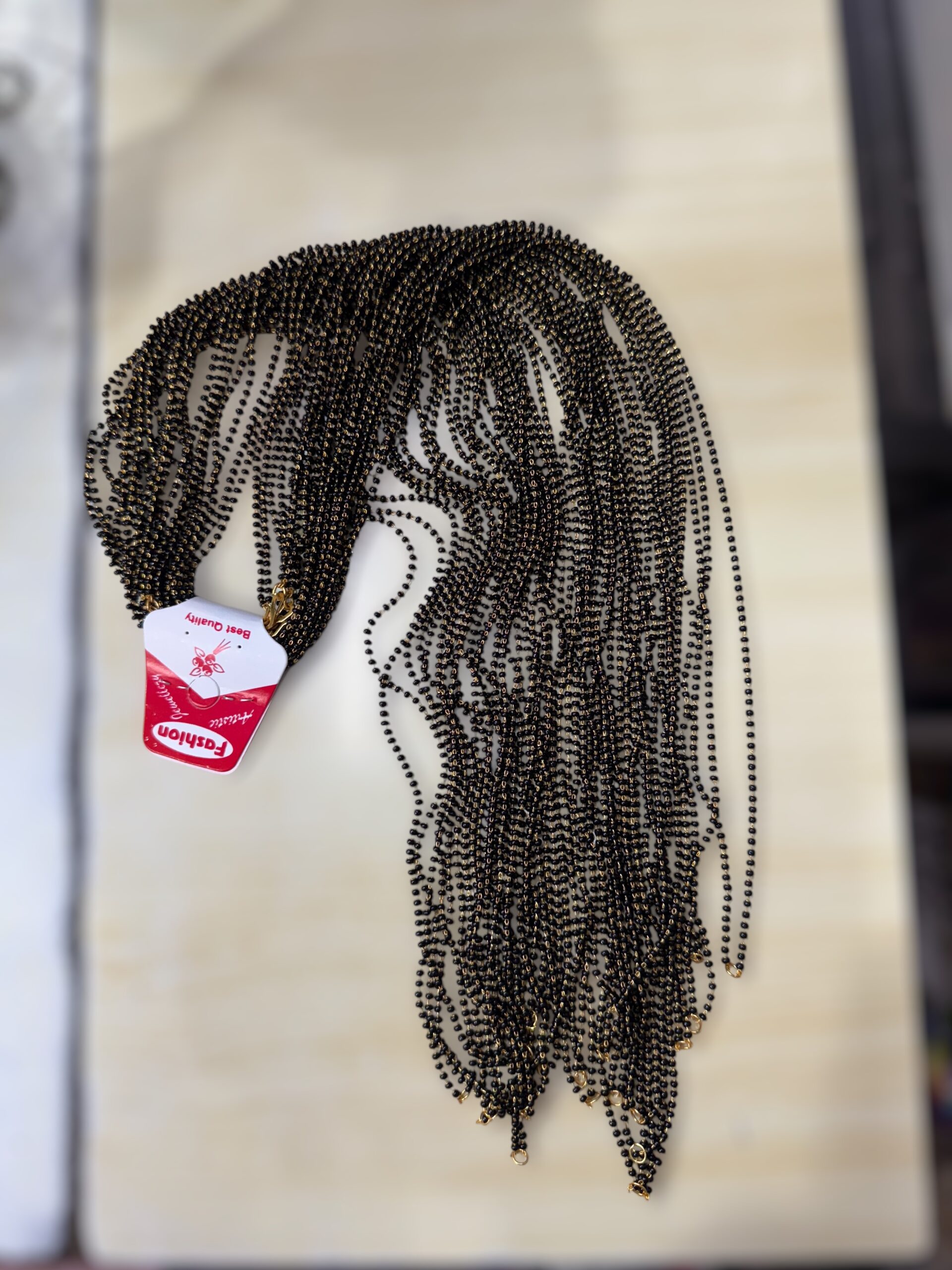 The chains are made of alternating small black and gold beads, which are considered auspicious and symbolize protection and marital commitment.